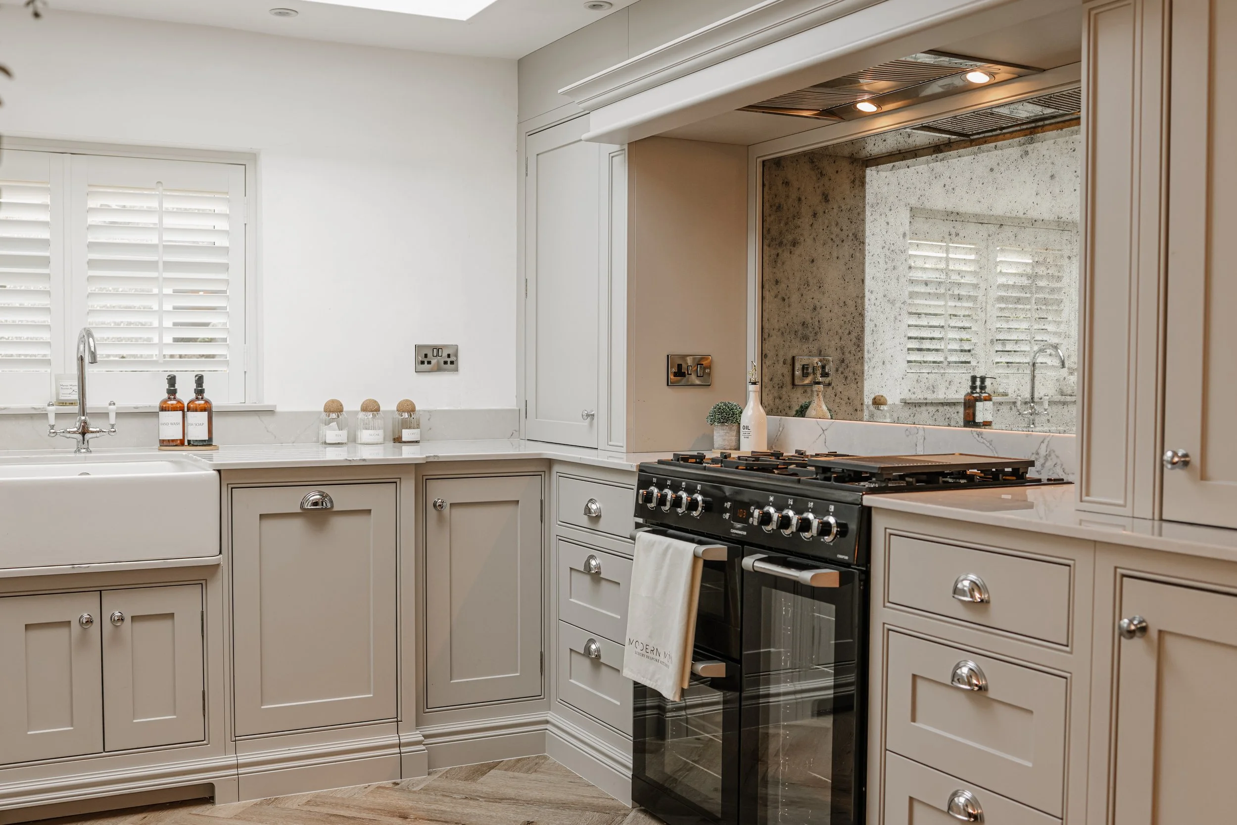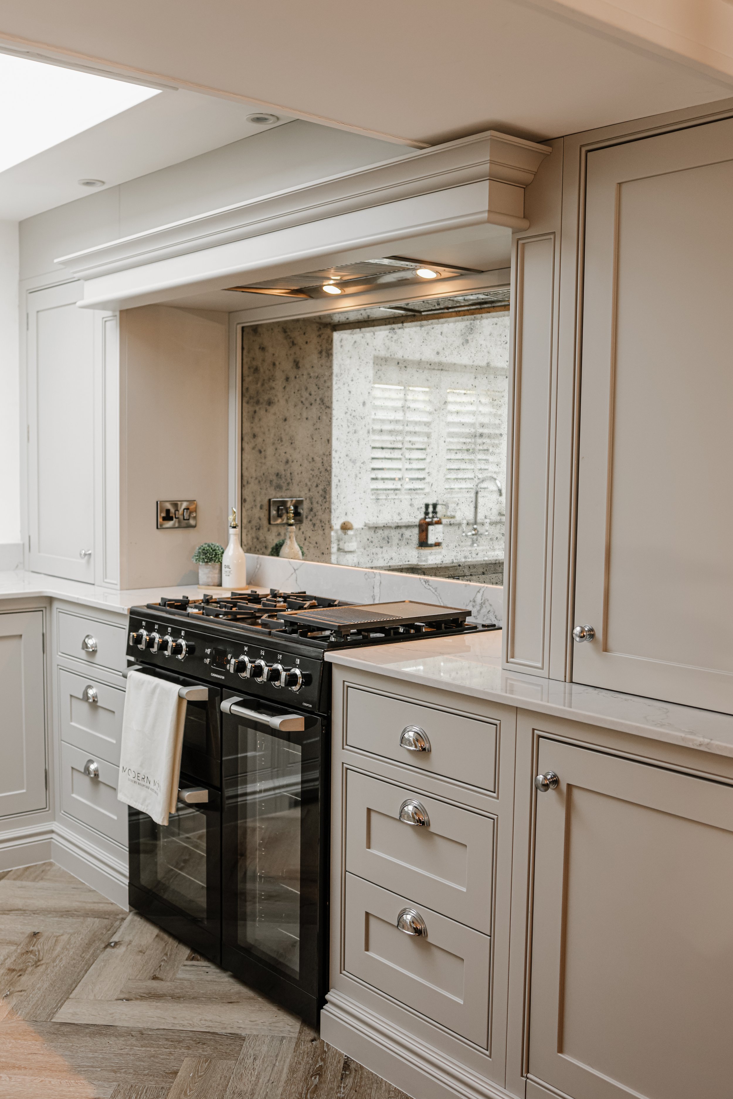 The antique mirror splashback played a vital role in this space, helping to offset the reduction in size of one of the windows. It beautifully reflects and amplifies the available natural light, bouncing it from the remaining windows and the central skylight